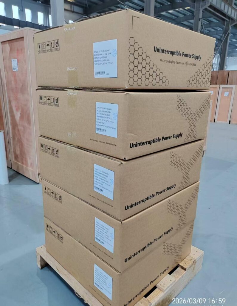 On March 9, 2026, RhimoPower dispatched a fresh batch of 3KVA rack mount UPS units (Model RM11-3KL-UNR) together with battery packs (Model UBR0896-9AH). The units were packed in reinforced export cartons, clearly labeled with full technical specifications, and palletized for safe international freight.